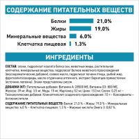 СОДЕРЖАНИЕ ПИТАТЕЛЬНЫХ ВЕЩЕСТВ: Белки: 21,0 % - Жиры: 19,0 % - Минеральные вещества: 6,0 % - Клетчатка пищевая: 1,3 % - Жирные кислоты Омега 3: 0,82 %.