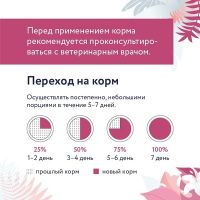 Рекомендации по кормлению: Переход с предыдущего рациона осуществлять постепенно, небольшими порциями в течение 5-7 дней. Рекомендации по кормлению могут варьироваться в зависимости от возраста, состояния, активности и условий содержания животного.