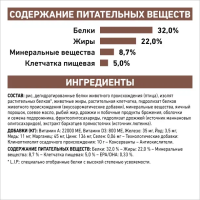СОДЕРЖАНИЕ ПИТАТЕЛЬНЫХ ВЕЩЕСТВ: Белки: 32,0 % - Жиры: 22,0 % - Минеральные вещества: 8,7 % - Клетчатка пищевая: 5,0 % - EPA/DHA: 0,33 %.