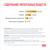 СОДЕРЖАНИЕ ПИТАТЕЛЬНЫХ ВЕЩЕСТВ: Белки: 34,5 % - Жиры: 15 % - Минеральные вещества: 7,4 % - Клетчатка пищевая: 2,1 % - Кальций: 0,8 % - Фосфор: 0,7 % - Натрий: 0,9 % - Магний: 0,05 % - Калий: 1 % - Хлориды: 1,9 % - Сера: 0,5 % - Общий таурин: 0,2 % - Вещества, подкисляющие мочу: кальция сульфат (0,7 %), DL-метионин.