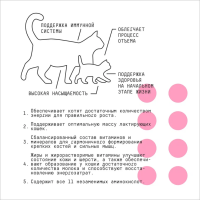 Содержит необходимое количество калорий, высококачественных белков, жиров и сбалансированный комплекс витаминов и минералов для правильного роста котят и поддержания оптимальной массы лактирующих кошек