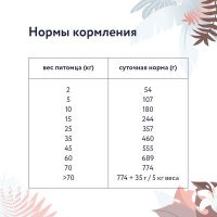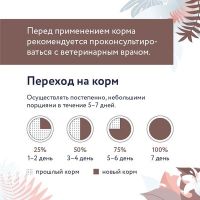 Рекомендации по кормлению: Переход с предыдущего рациона осуществлять постепенно, небольшими порциями в течение 5-7 дней. Рекомендации по кормлению могут варьироваться в зависимости от возраста, состояния, активности и условий содержания животного.