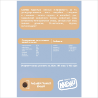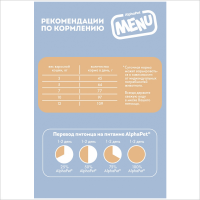 AlphaРet Menu — натуральный сбалансированный рацион со свежим мясом, который точно понравится вашему питомцу! Свежее мясо, а также деликатная термическая обработка позволяет максимально сохранить естественные витамины и минеральные вещества в продукте, что обеспечивает прекрасный вкус и отличную усвояемость рациона.
