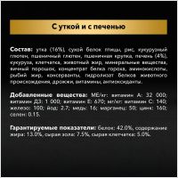 утка (16%), сухой белок птицы, рис, кукурузный глютен, пшеничный глютен, пшеничная крупка, печень (4%), кукуруза, клетчатка, животный жир, минеральные вещества, яичный порошок, концентрат белка гороха, аминокислоты, рыбий жир, консерванты, гидролизат белков животного происхождения, дрожжи, витамины, антиоксиданты.