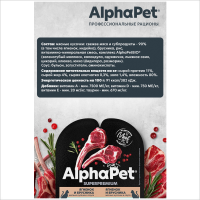 AlphaРet Superpremium — выбор владельцев, которые хотят быть уверены в том, что дают своему питомцу лучшее из возможного: натуральные отборные ингредиенты, высокое содержание животного белка и свежее мясо в основе состава. AlphaPet Superpremium ставит точку в споре о том, чем кормить питомца.