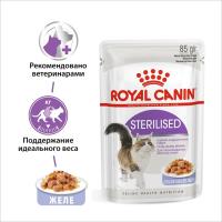 Консервы Royal Canin Sterilised - влажный корм для стерилизованных кошек, в виде мелких кусочков в желе подходят для стерилизованных кошек старше 1 года.